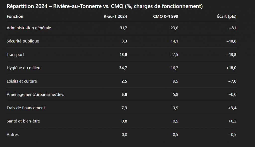 Pour réference: Budget 2024 – Rivière-Au-Tonnerre - Réequilibrage des finances : Rééquilibrer les différents postes budgétaires en s’inspirant des meilleures pratiques de la Commission municipale du Québec pour les municipalités de moins de 2000 habitants, adaptées à notre contexte nordique, afin de renforcer la stabilité financière et l’efficacité des dépenses.